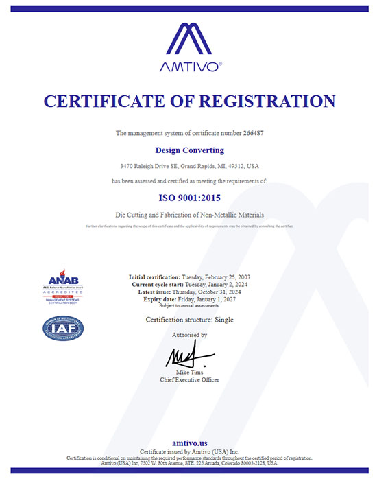 American Systems Registrar, a provider of ISO 9001:2015 third-party system registration and accredited by the ANSI National Accreditation Board, attests that: Design Converting with a scope of: Die Cutting and Fabrication of Non-Metallic Materials has established a quality management system that is in conformance with the International Quality System Standard ISO 9001:2015.